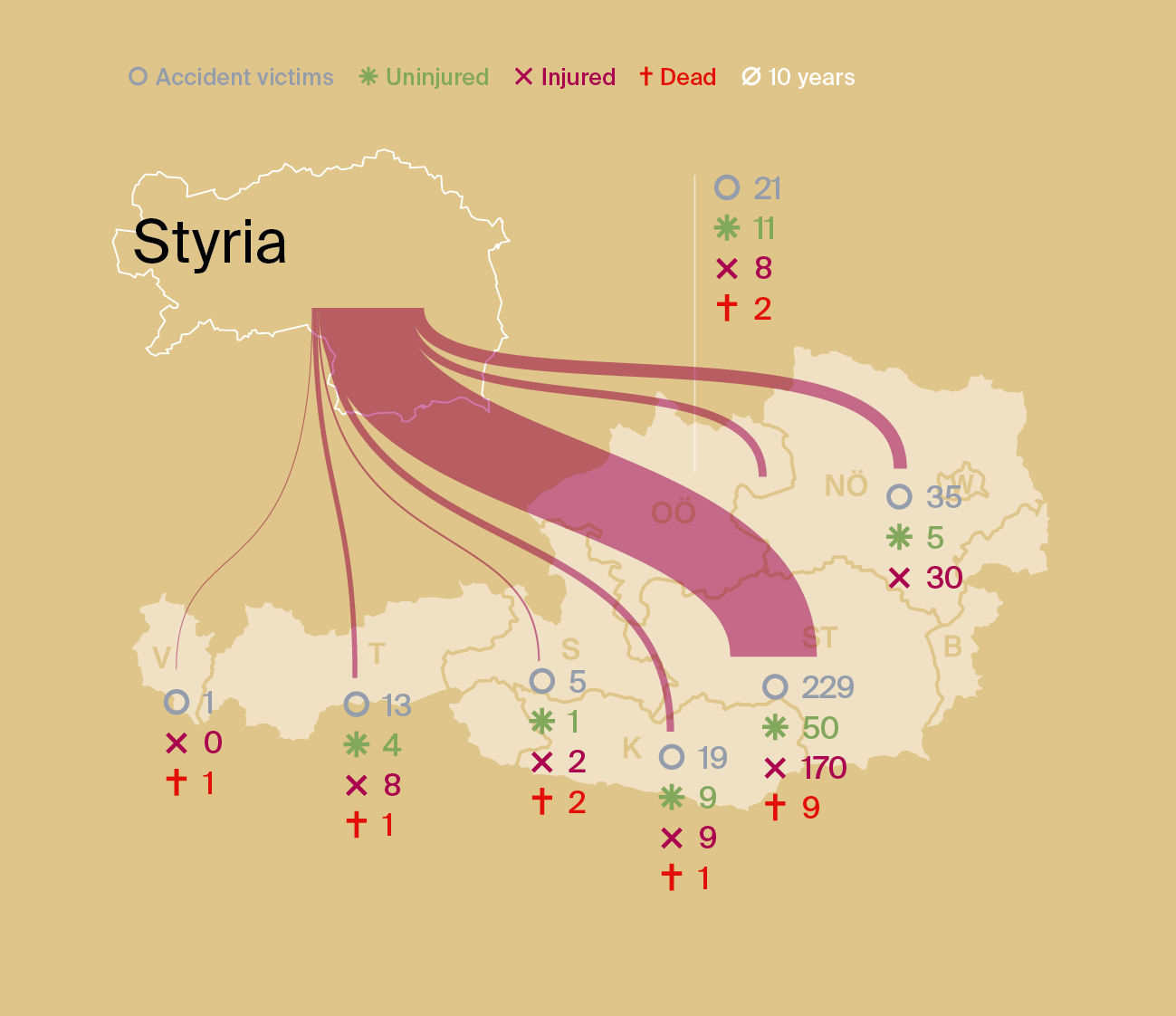 If we break down the accident victims according to their place of residence and look at where in Austria they have an accident, we get these flows, which we show graphically for each federal state. The last graph clearly shows that many of the accident victims do not come from Austria, but from other countries.